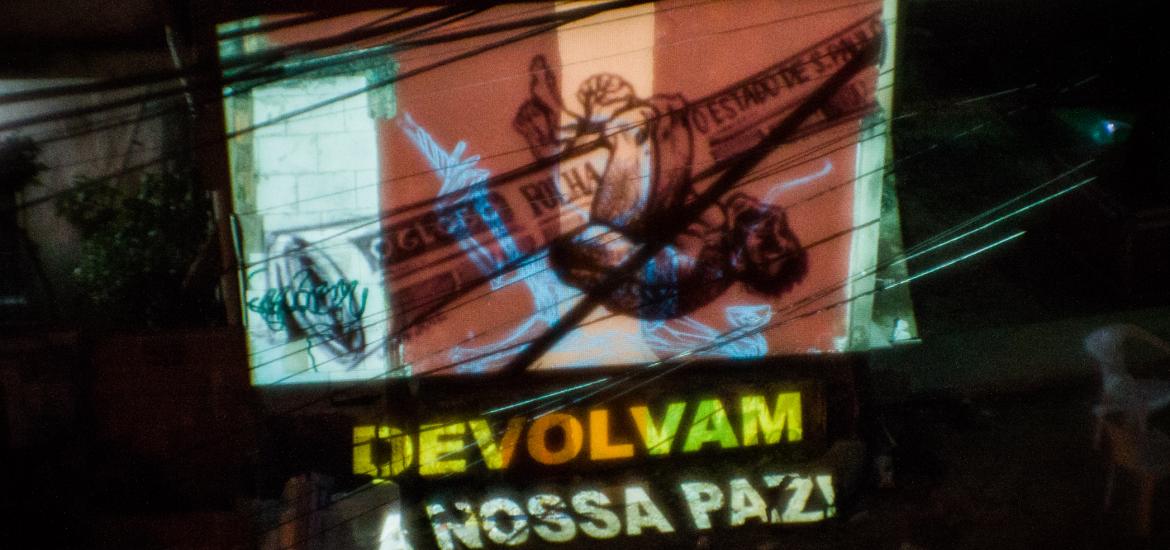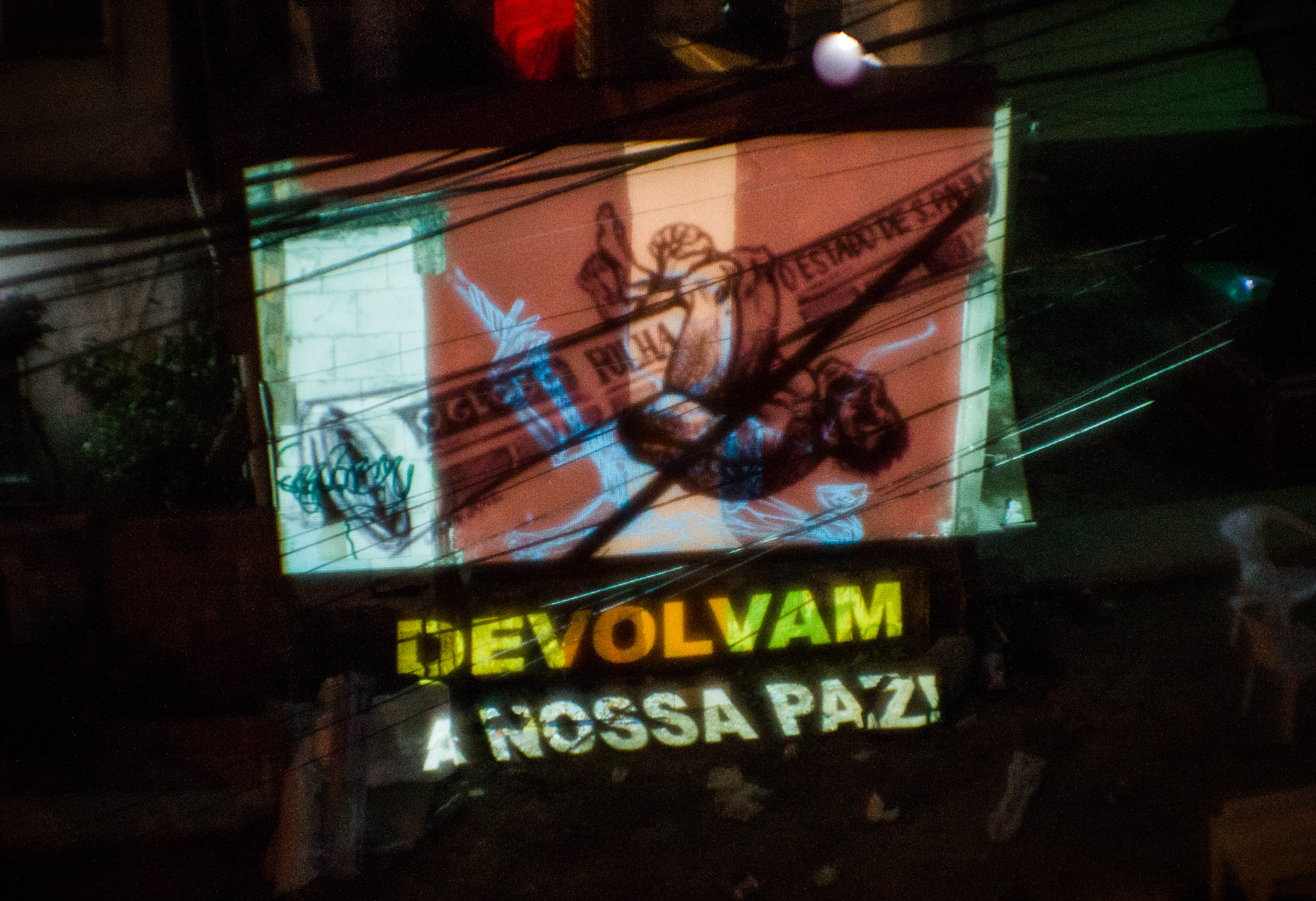 Ao anoiteceu o Coletivo Projetação expôs imagens e frases retratando a realidade da favela. Artistas, moradores e ativistas de movimentos sociais contribuíram para a composição das frases.